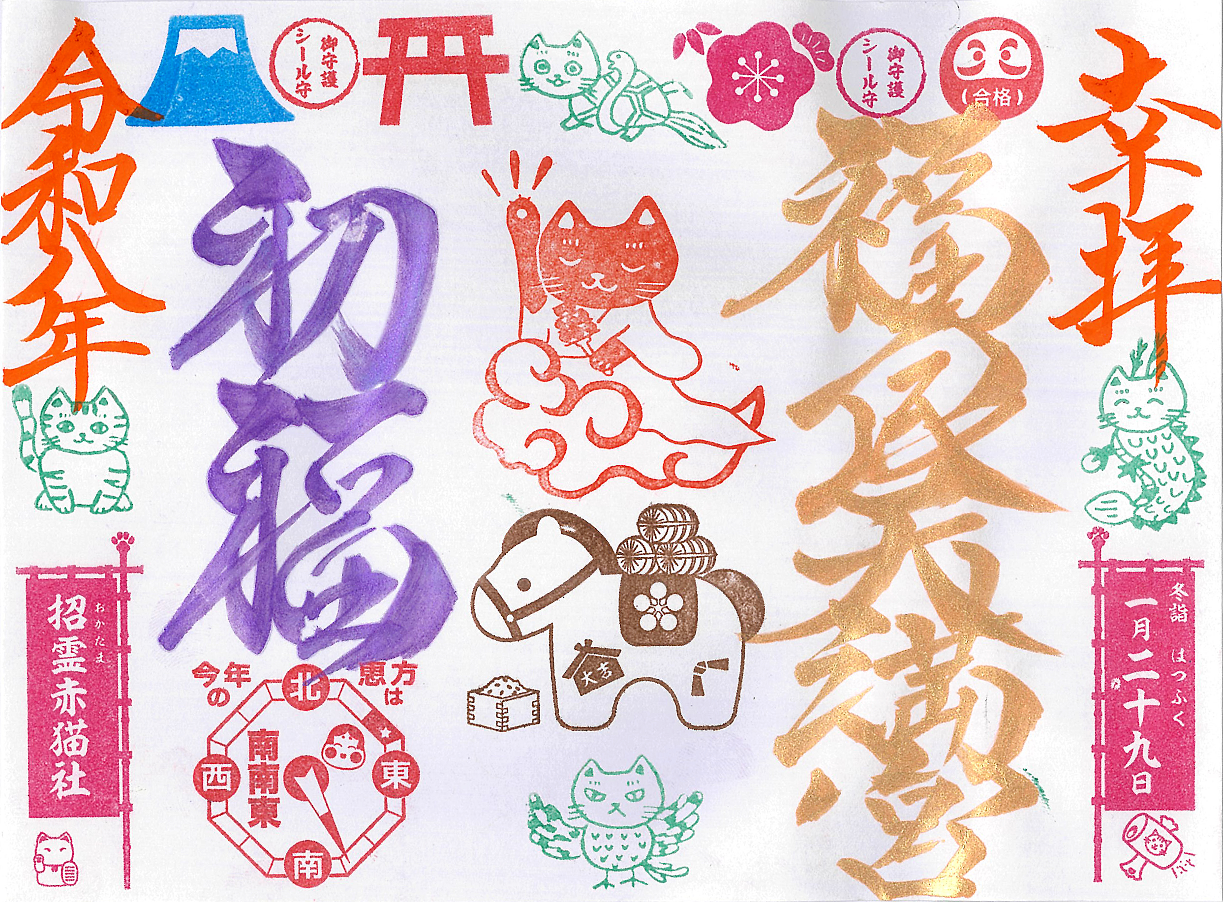 赤猫様が七福神と共に授与する福袋《御守シール》の部分に、御守護シールを貼り、御朱印が「道中安全・諸願成就の御守」となります。