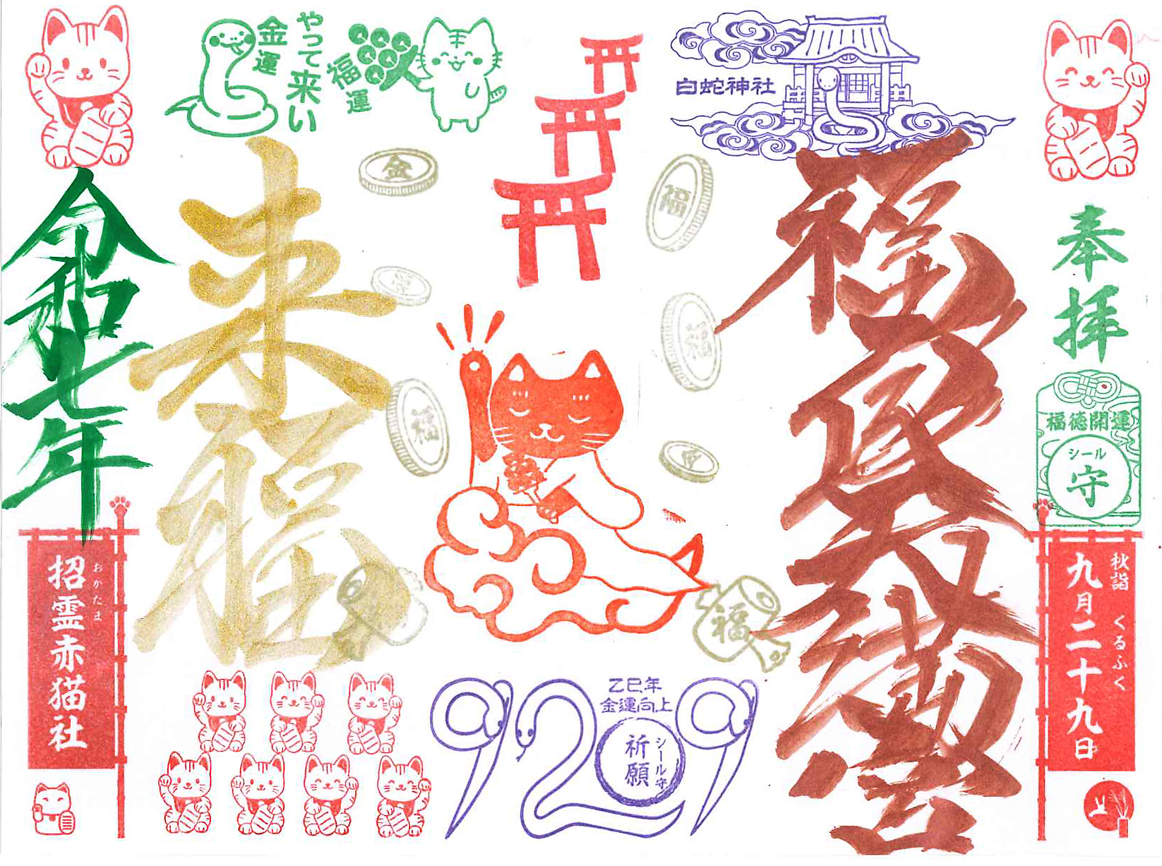 今年は金運向上のへび年。白蛇様と赤猫様が「来る福」の日に「金運福運やってこい」と鈴を鳴らし、白蛇神社に祀られる白蛇様が赤猫に金運を授け、皆様の元に財や福を届けに天下る御朱印です。左手上げは人まねき、右手上げは金運向上、たくさんの赤猫達が幸せをもたらします。